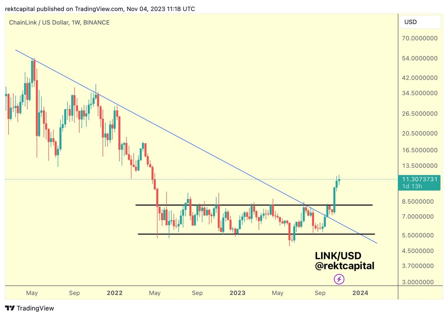 Pseudonymous analyst Rekt Capital tells his 365,500 followers on the social media platform X that LINK is now within the midst of a long-term uptrend.