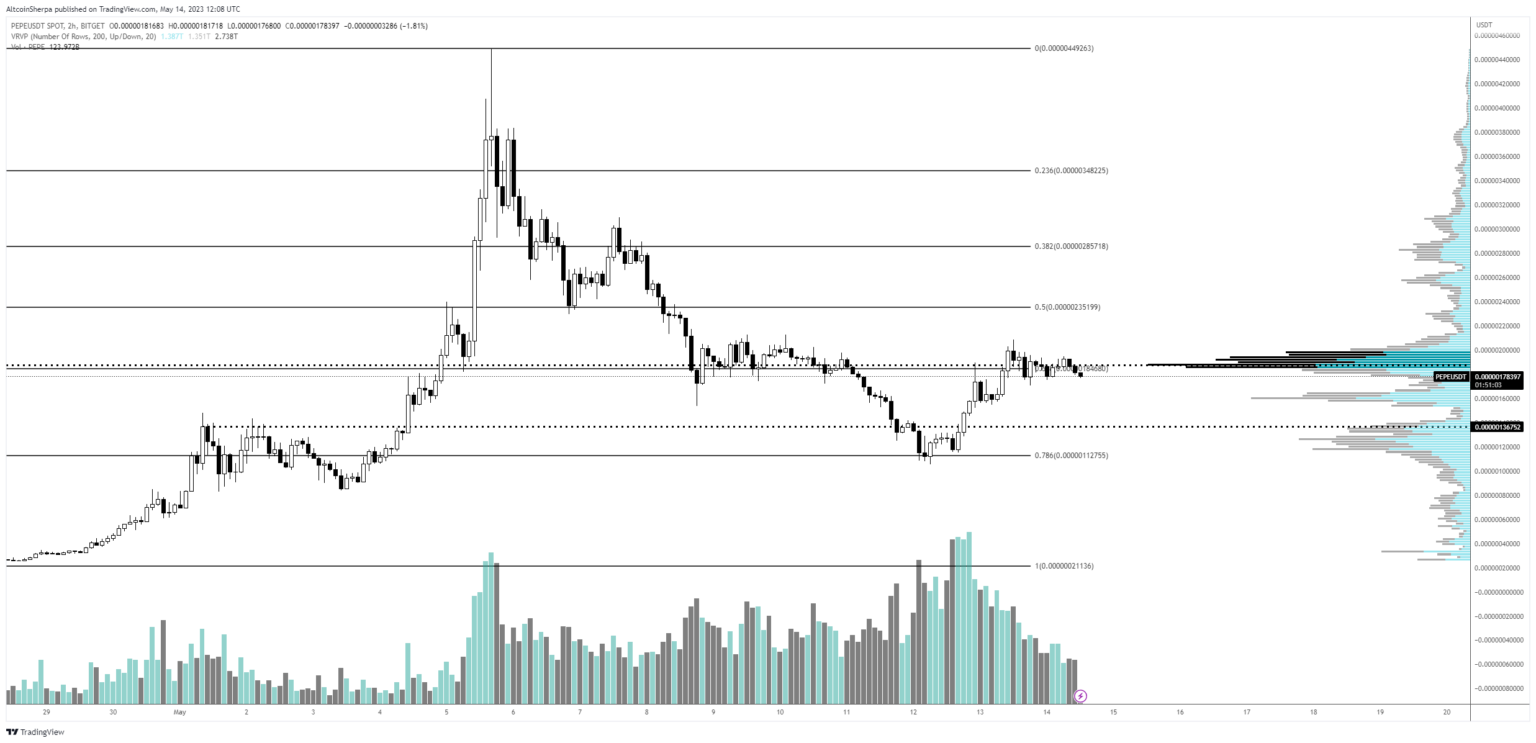 Altcoin Sherpa makes use of Fibonacci retracement ranges, a way of technical evaluation for figuring out key ranges for worth targets, to foretell a cheaper price stage for Pepe. Taking a look at his chart, Sherpa signifies Pepe may decline to $0.00000136 within the close to time period.