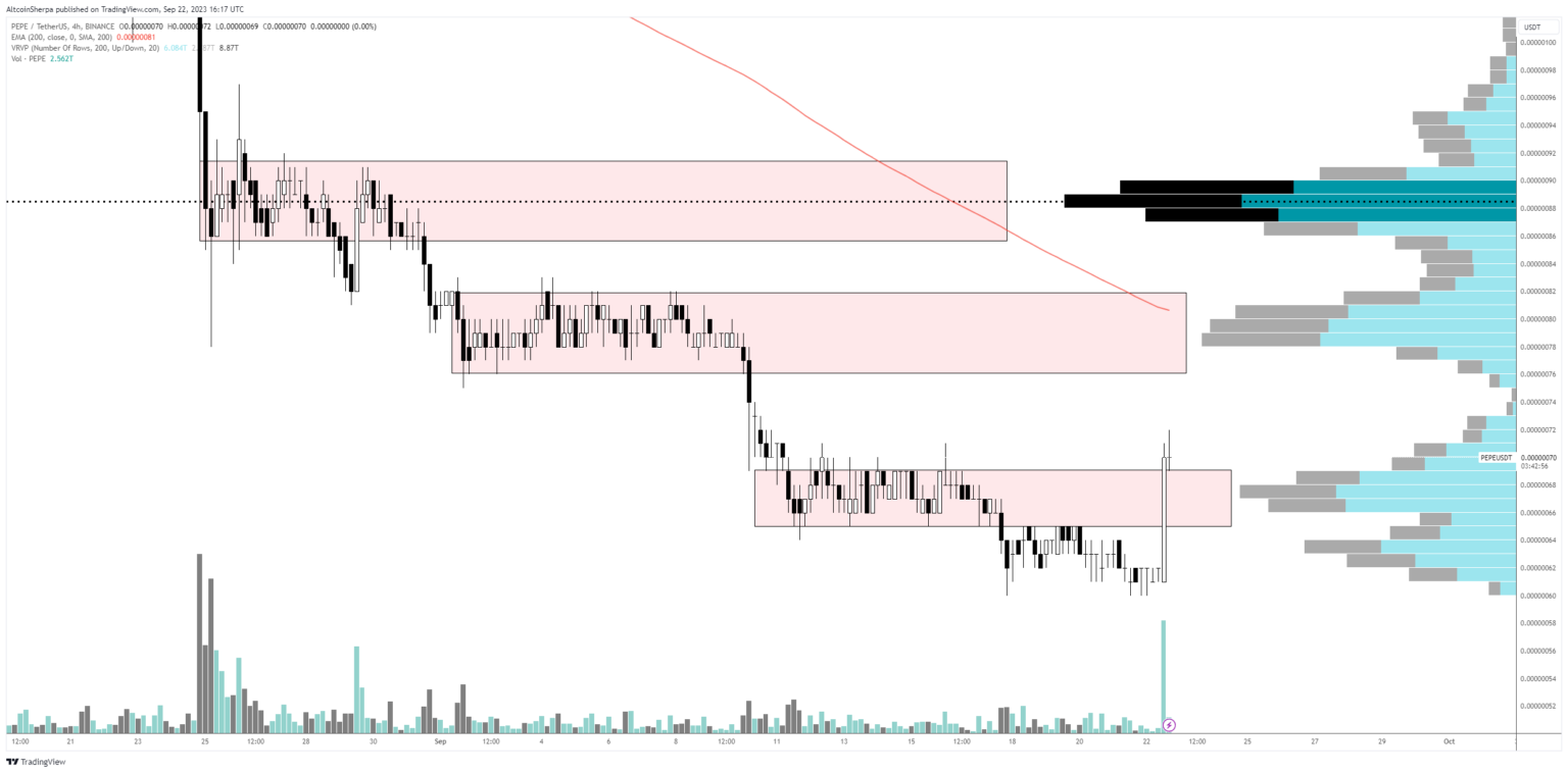 “PEPE: good transfer right now, I didn’t actually see this one coming. The amount profile reveals three important resistance areas, with the primary one getting damaged now. I extremely doubt it is a full reversal, however a bit extra upside could also be in retailer. Could be cautious with this one total.”