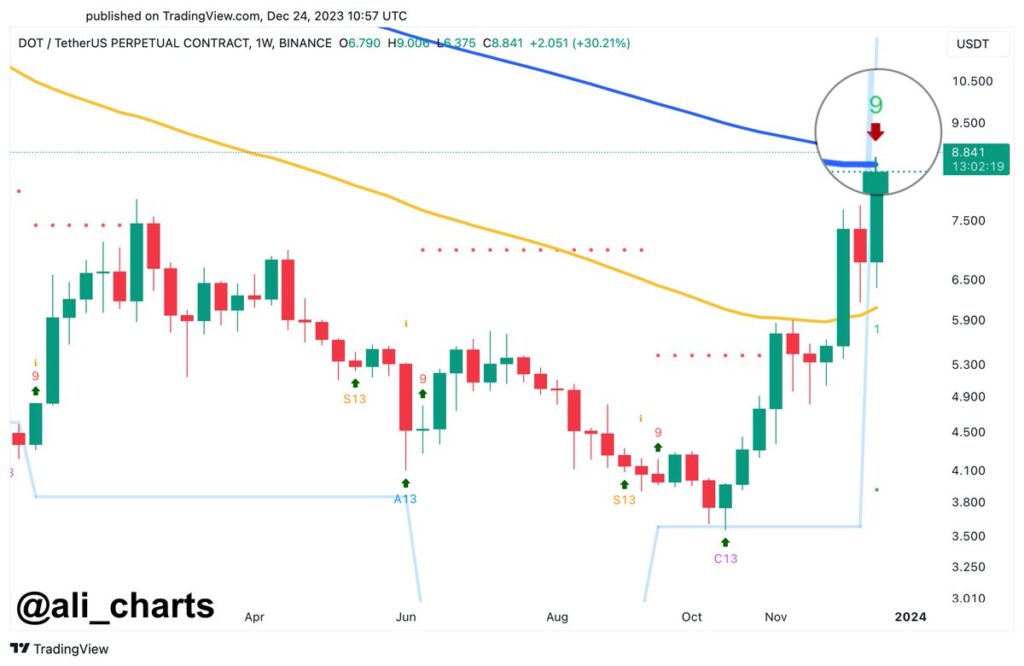 “Polkadot: the TD Sequential indicator flags a promote on the weekly chart for DOT, simply because it hits a key resistance on the 100-EMA (exponential transferring common). This might result in a spike in profit-taking, doubtlessly driving DOT all the way down to $7.50.”