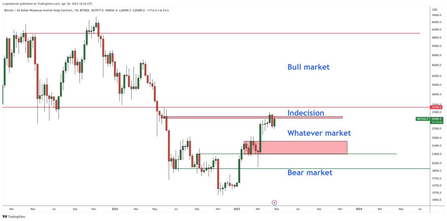 Pseudonymous analyst DonAlt tells his 482,300 Twitter followers that Bitcoin is buying and selling under his “indecision” stage across the $30,000 worth space.