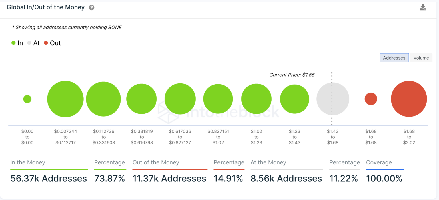 In accordance with IntoTheBlock, 56,370 BONE addresses are within the inexperienced, representing practically 75% of all Bone ShibaSwap wallets.