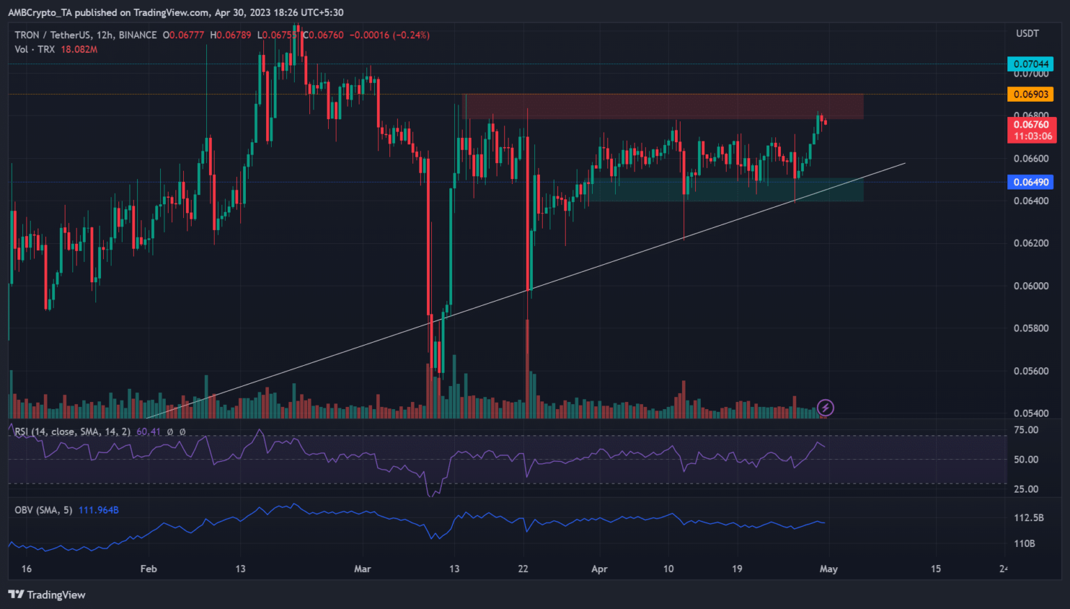 Tron [TRX] noticed aggressive demand on 26 April after hitting a key demand zone and bullish order block close to $0.06400. The demand noticed the token rally to key resistance and bearish order block at $0.06800.