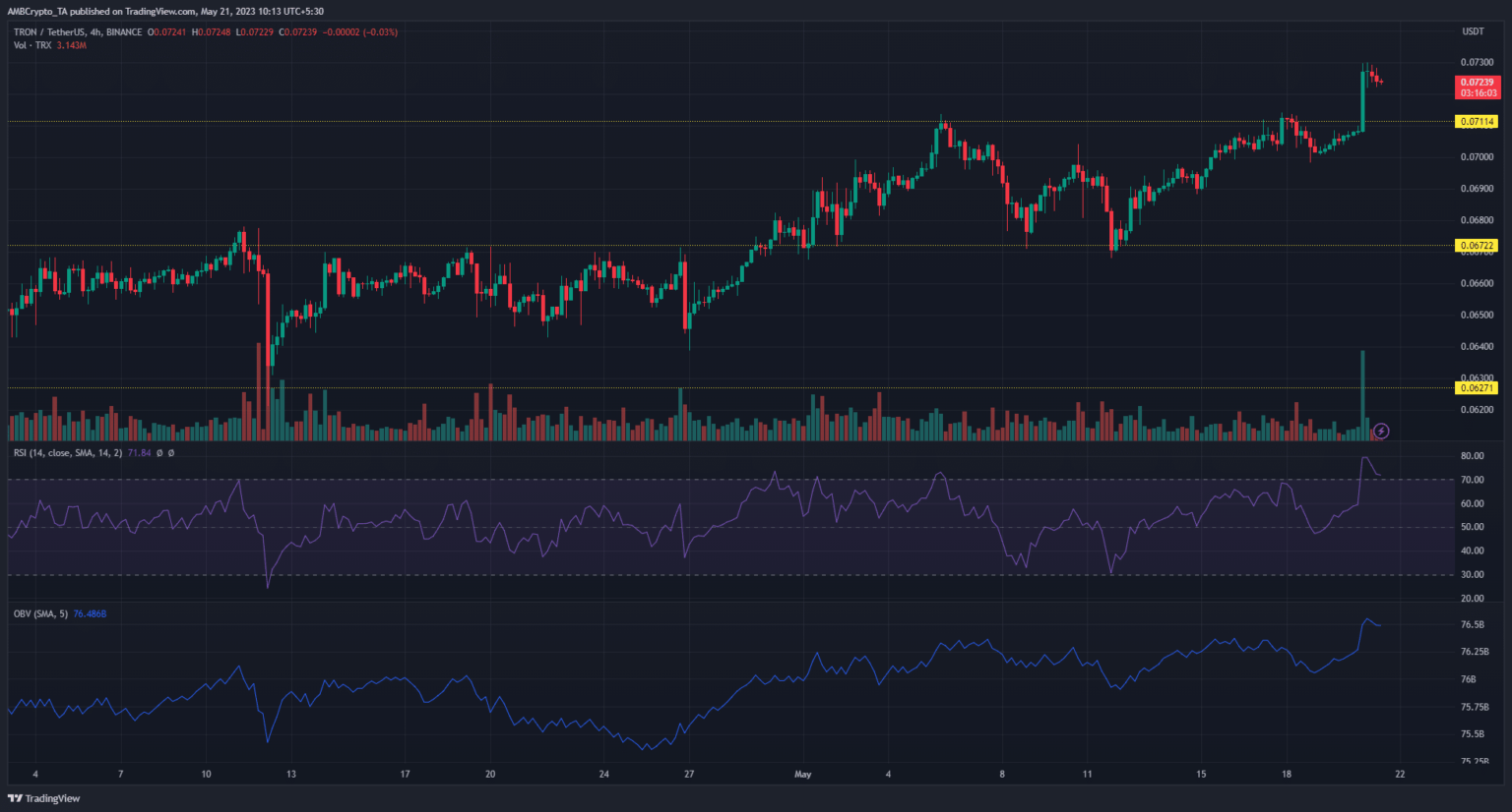 On-chart indicators supported a continuation of the bullish momentum. The On Steadiness Quantity (OBV) maintained its upward motion to trace at rising quantity for Tron. The Relative Energy Indicator (RSI) additionally made a robust push from the impartial 50 stage into the overbought zone and stood at 71.8, as of press time.