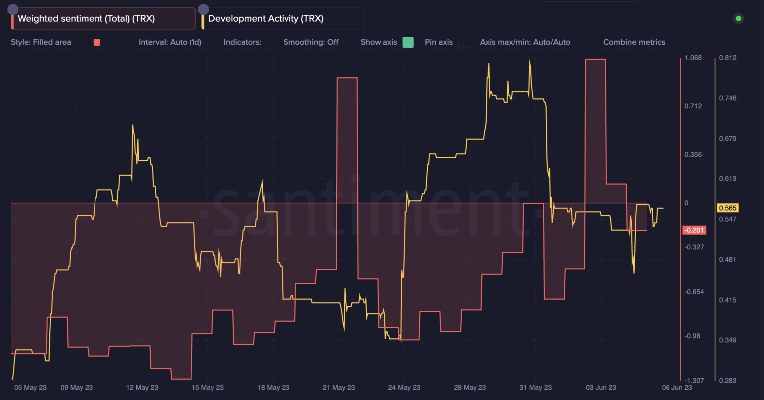 Moreover, a have a look at the weighted sentiment additionally confirmed a major drop over the previous few days. TRX’s weighted sentiment dropped from 1.06 on 3 June to -0.201 as of 6 June. This indicated that the crypto group didn’t precisely have a optimistic outlook towards the community.