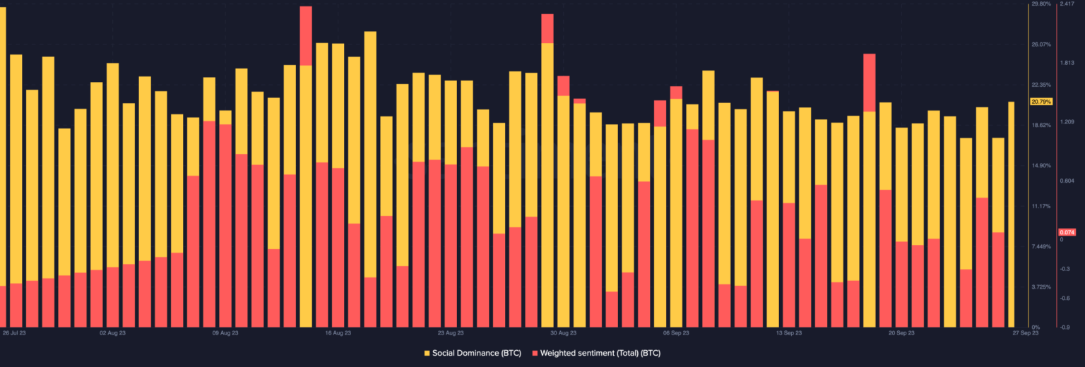 Nevertheless, social dominance was not the one metric with a change. As of 25 September, Bitcoin’s weighted sentiment was -0.079. After the event, the metric jumped into the optimistic area. At press time, the weighted sentiment was 0.074.
