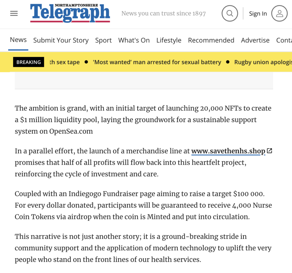 On Wednesday the Northamptonshire Telegraph ran an article selling the ‘Nurse Coin Token and NFT’ through its Your World contributor system, which permits anyone to publish tales on the newspaper’s web site.