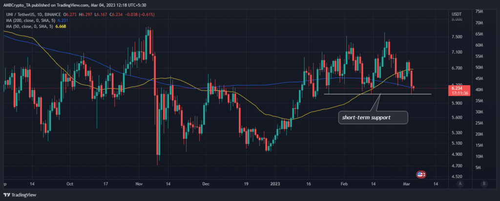 UNI traded at $6.23 at press time, after tanking by 18% from its February peak. Nonetheless, this pullback places it throughout the $6 to $6.11 assist vary.