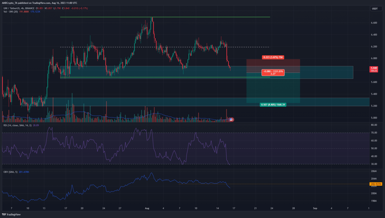 Bitcoin [BTC] dropped from $29.6k on 14 August to commerce at $29.1k at press time. Though this was solely a 1.66% drop, it has affected the sentiment within the altcoin market closely. Uniswap confronted intense promoting strain over the previous 24 hours.