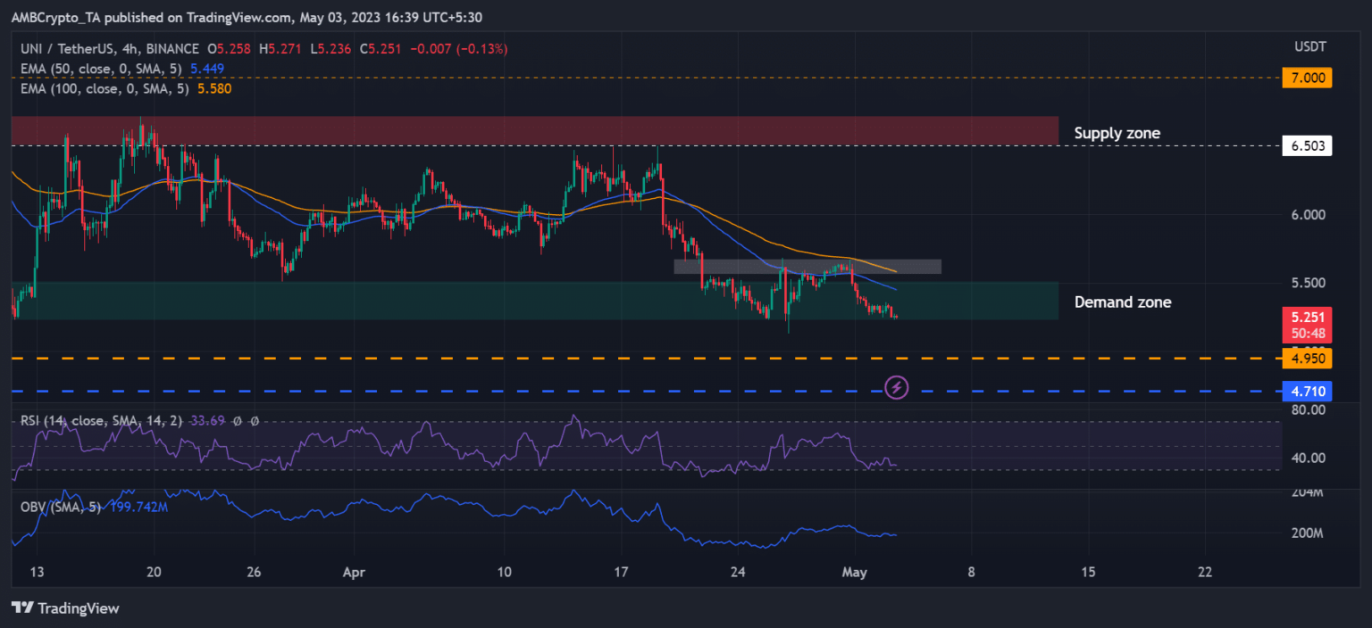 Since dropping to a key demand zone on 21 April, Uniswap [UNI] hasn’t inflicted a powerful rebound. Latest restoration makes an attempt confronted resistance at an impediment close to $5.57 – $5.66 (white zone).