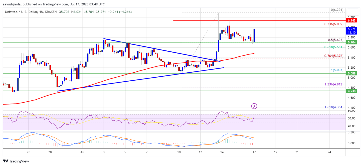 There was additionally a break above a serious contracting triangle with resistance close to $5.35 on the 4-hour chart of the UNI/USD pair. The pair gained tempo and examined the $6.30 zone. A excessive is fashioned close to $6.291 and the value began a draw back correction.