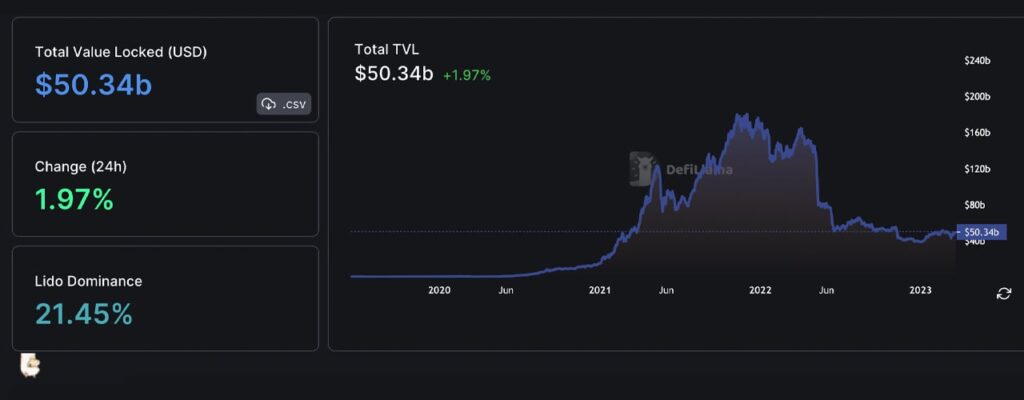 Defi TVL in response to defillama.com stats on March 22, 2023.