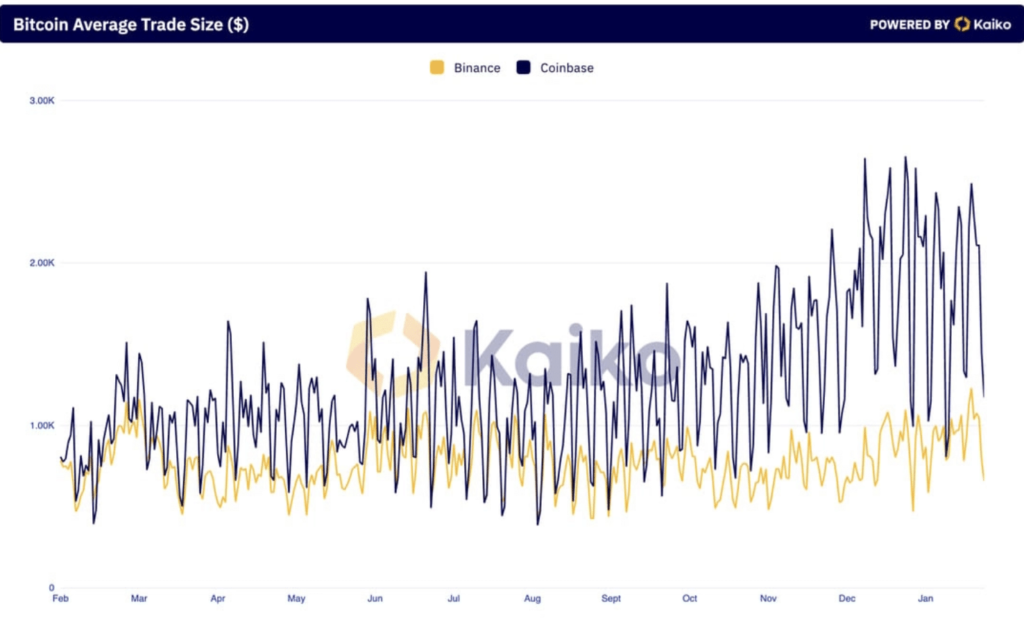 Analyzing Bitcoin’s common commerce measurement on Binance, which serves as a proxy for institutional participation, reveals that it reached its highest stage in a 12 months on thirteenth February, persistently staying above $1,000 because the begin of 2024.
