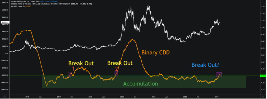 Mignolet, an analyst and writer at CryptoQuant, posted an evaluation utilizing BTC’s Binary CDD, which is a metric used to interpret long-term holders’ actions.