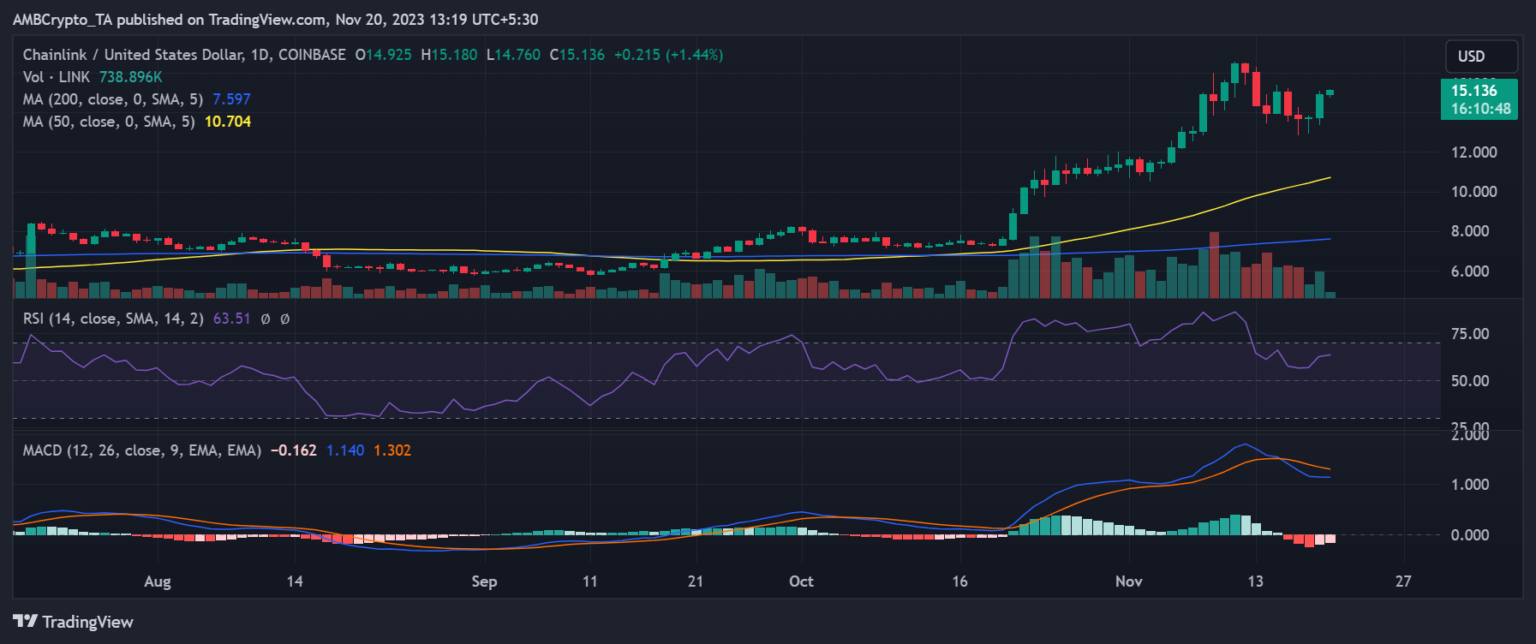 Analyzing Chainlink’s value actions revealed a optimistic begin to the week. On the each day timeframe, it recorded an 8.45% enhance in worth by the shut of buying and selling on the 18th of November. It reached round $14.9 in comparison with its opening value of round $13.7.