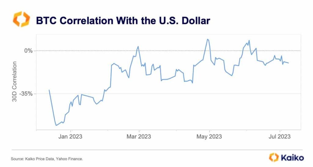 Nevertheless, this relationship has largely dissipated in 2023. In line with crypto market knowledge supplier Kaiko, the inverse correlation between BTC and the USD fell from -61% to -10 on a year-to-date (YTD) foundation, which was virtually negligible.