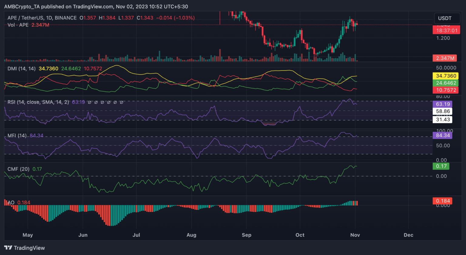 Because of the final market development within the final month, APE’s value rallied by 20% between 2 and 29 October, after which it peaked at $1.4. At $1.36 on the time of writing, APE’s worth has since dropped by 3%.