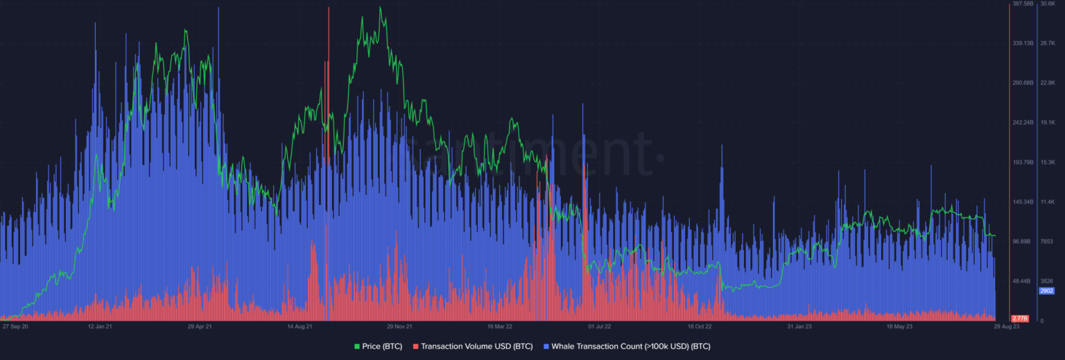 Through the bear market, whale transaction counts have dropped, as has BTC’s transaction quantity.