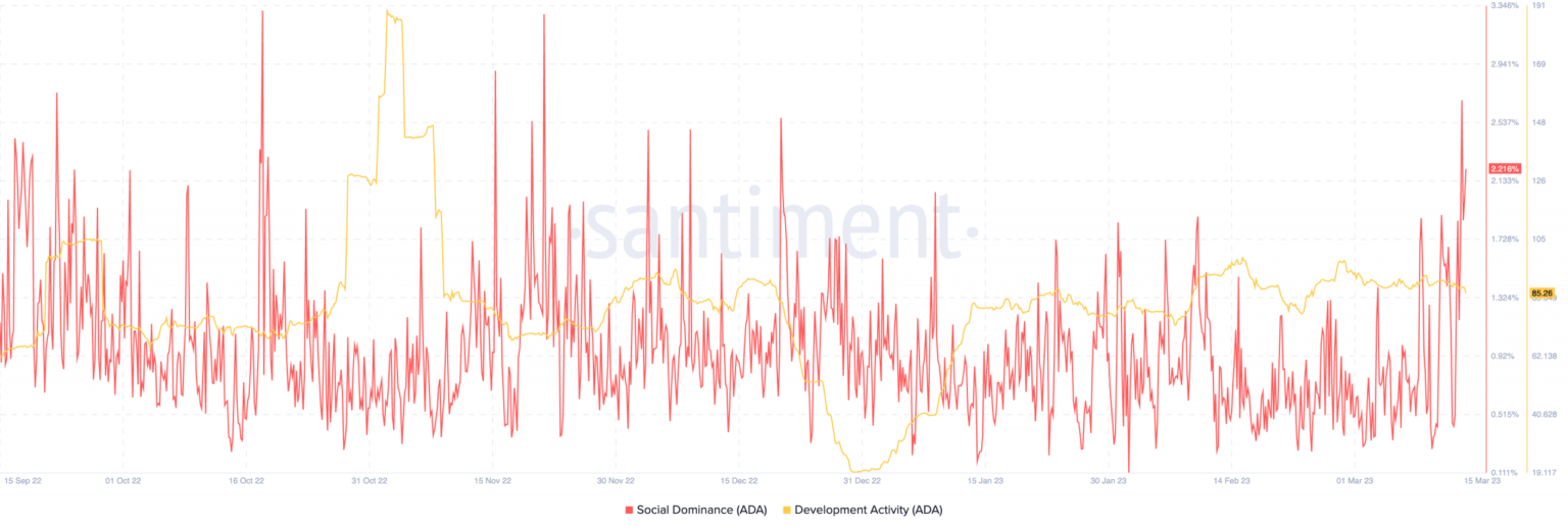 Social dominance gauges the proportion of discussions round an asset among the many top-100 per market capitalization. Nevertheless, the challenge’s picture appears to be on its option to redemption because the metric hit 2.687% on 14 March. Regardless of its modest lower on the time of writing, the situation confirmed that Cardano’s mentions throughout socials had turn out to be mainstream.