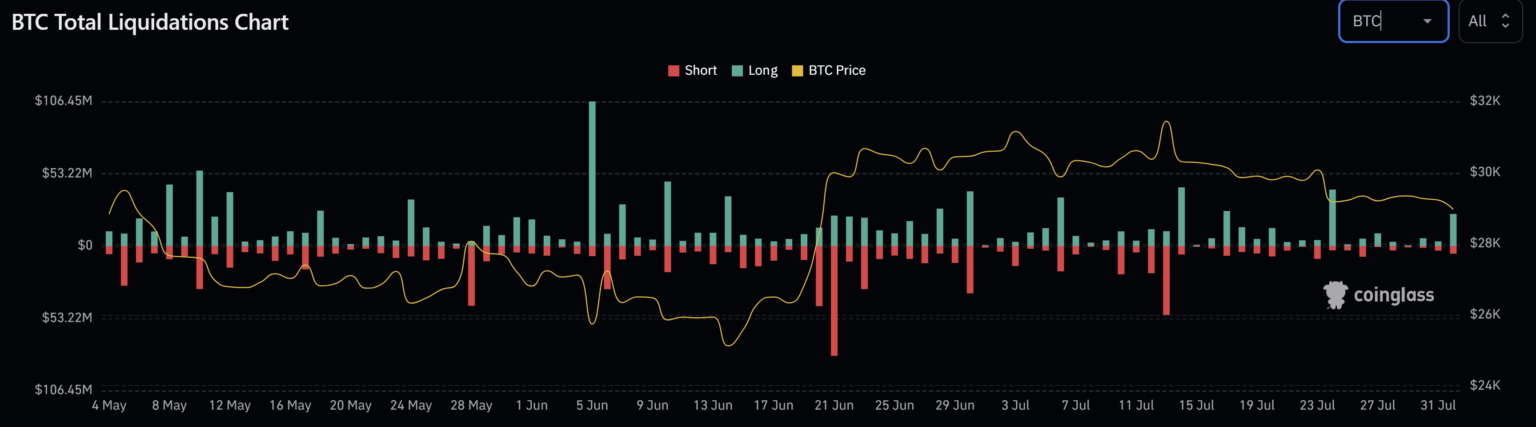 James V. Straten, a famend on-chain analyst, not too long ago tweeted: “Bitcoin drops under $29,000 as open curiosity spikes whereas funding charges go decrease. Because of the largest lengthy liquidation since twenty fourth July.” Because the analyst states, Bitcoin’s value development could be majorly attributed to lengthy liquidations. The liquidation information from Coinglass signifies that $23.6 million in BTC longs have been liquidated, a comparatively small quantity however important contemplating the market’s state.