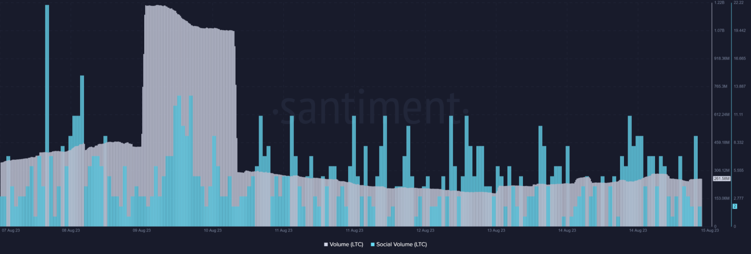 - Litecoin’s social quantity and buying and selling quantity declined final week.