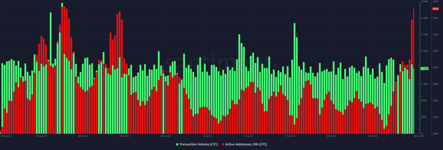 A potential cause for the underwhelming final result may very well be the uncertainty that prevailed available in the market in July. An evaluation of Litecoin’s on-chain metrics revealed that transaction quantity stayed throughout the similar relative vary.