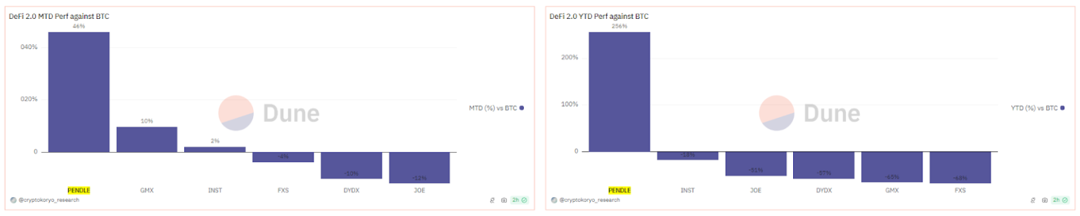DeFi 2.0 designates a number of narratives, however latest evaluation considers a number of consultant tasks. Pendle emerged because the rational chief in worth development, each in greenback phrases and in opposition to BTC. Different tasks within the DeFi 2.0 area of interest embody Dealer Joe (JOE), GameX (GMX), Instadapp (INST), Frax Share(FXS) and DyDx(DYDX).