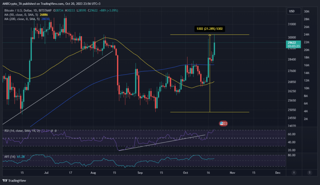 Let’s recap Bitcoin’s newest efficiency to completely perceive the state of affairs. Bitcoin has been rallying since mid-September and has to this point achieved a 21% upside from as little as $24,920. This rally peaked at barely above $30,000 within the final 24 hours at press time.