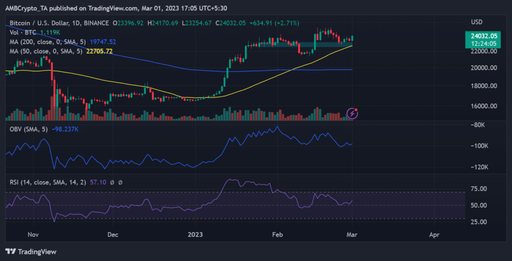 Though Bitcoin’s [BTC] worth couldn’t break over the $23,000 resistance zone, the community’s block manufacturing issue has continued to rise steadily. Nonetheless, it had rebounded and was reattempting a check on the $24,000 worth vary at press time, in line with the examined each day interval chart.