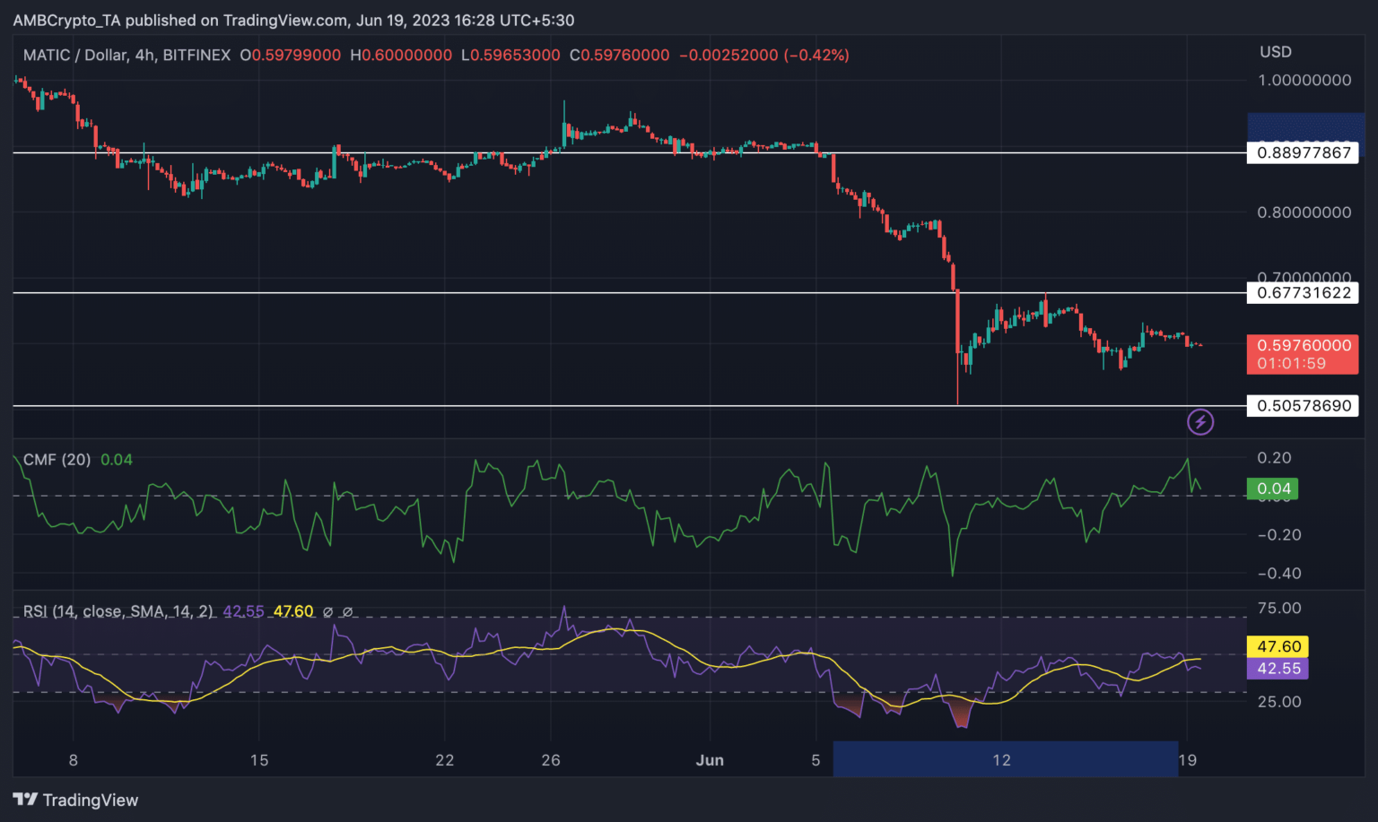 Whereas Polygon holds a good place within the zkEVM area, there’s nonetheless room for development for its native token. MATIC skilled a major worth drop of 40% between 5 – 10 June. Since then, the token’s worth has fluctuated between $0.677 and $0.505, with the press time worth at $0.598.