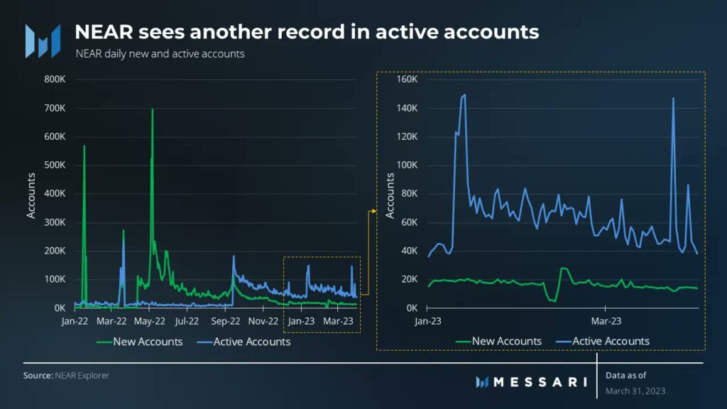 Throughout the first quarter of 2023, the protocol continued to take care of its excessive degree of day by day lively accounts, which had reached a file excessive within the earlier quarter. The community had a median of 64,000 day by day lively accounts in Q1, with Sweat Financial system, Aurora, Spin.fi, and NEAR Crowd being the key contributors to its exercise.