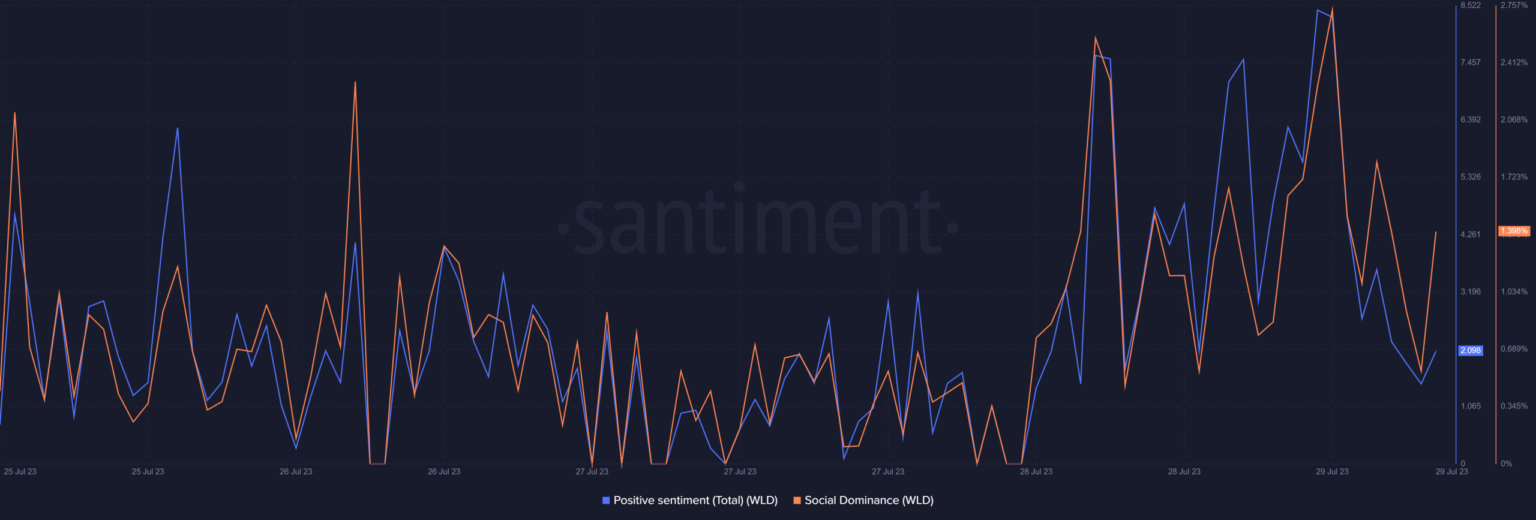 Constructive sentiment across the coin additionally rose, suggesting buyers’ confidence in WLD was excessive.