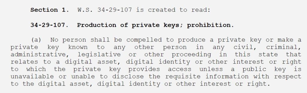 Wyoming lawmakers have handed a invoice that may prohibit courts within the state from forcing somebody to reveal their digital asset non-public keys, with one minor exception.
