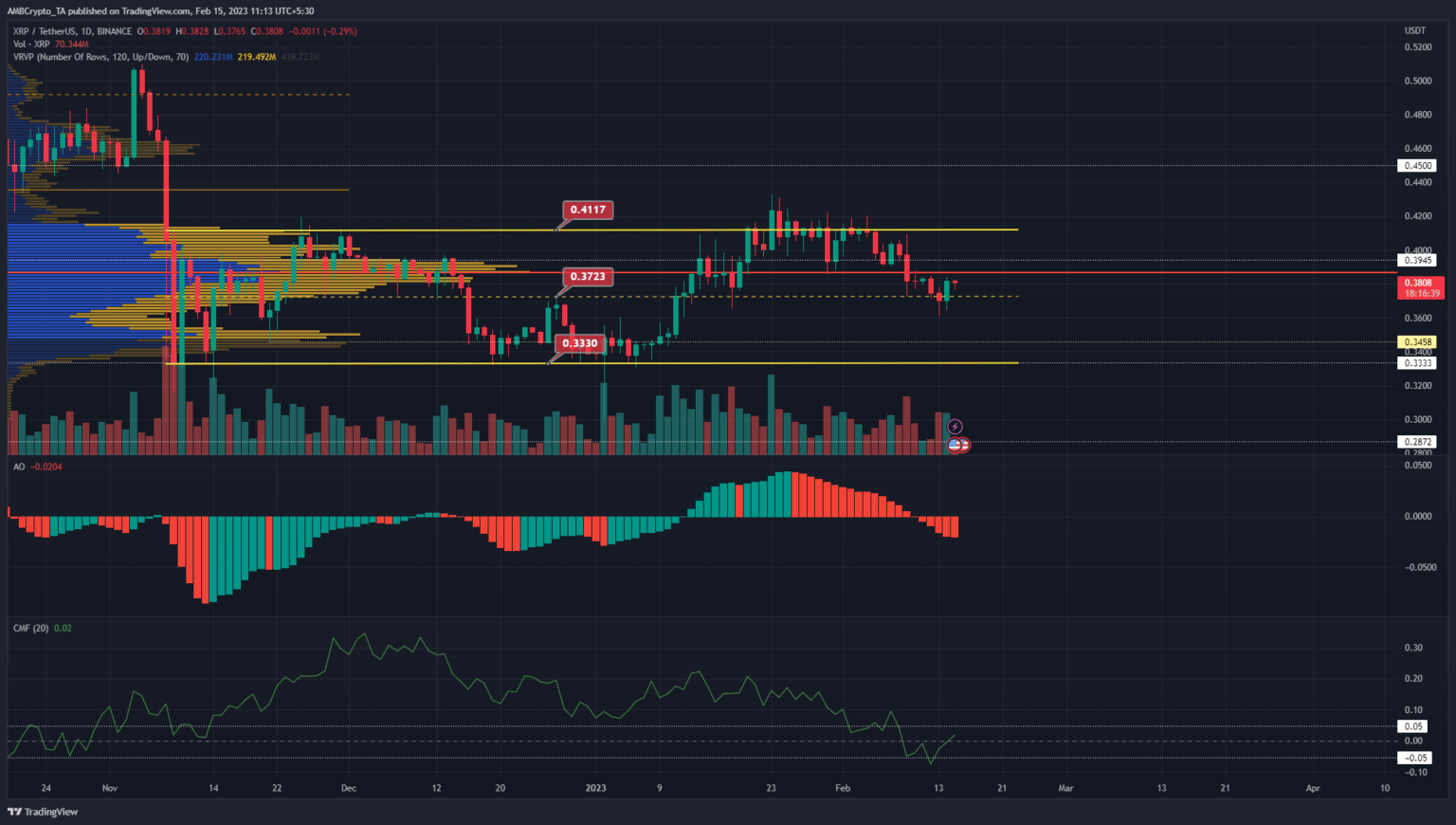 Ripple [XRP] traded inside a variety and the bulls pressured a bounce from the mid-range mark at $0.37. Whereas this bounce impressed decrease timeframe bullish momentum, the proof at hand confirmed that $0.395 may pose stiff resistance to the value.
