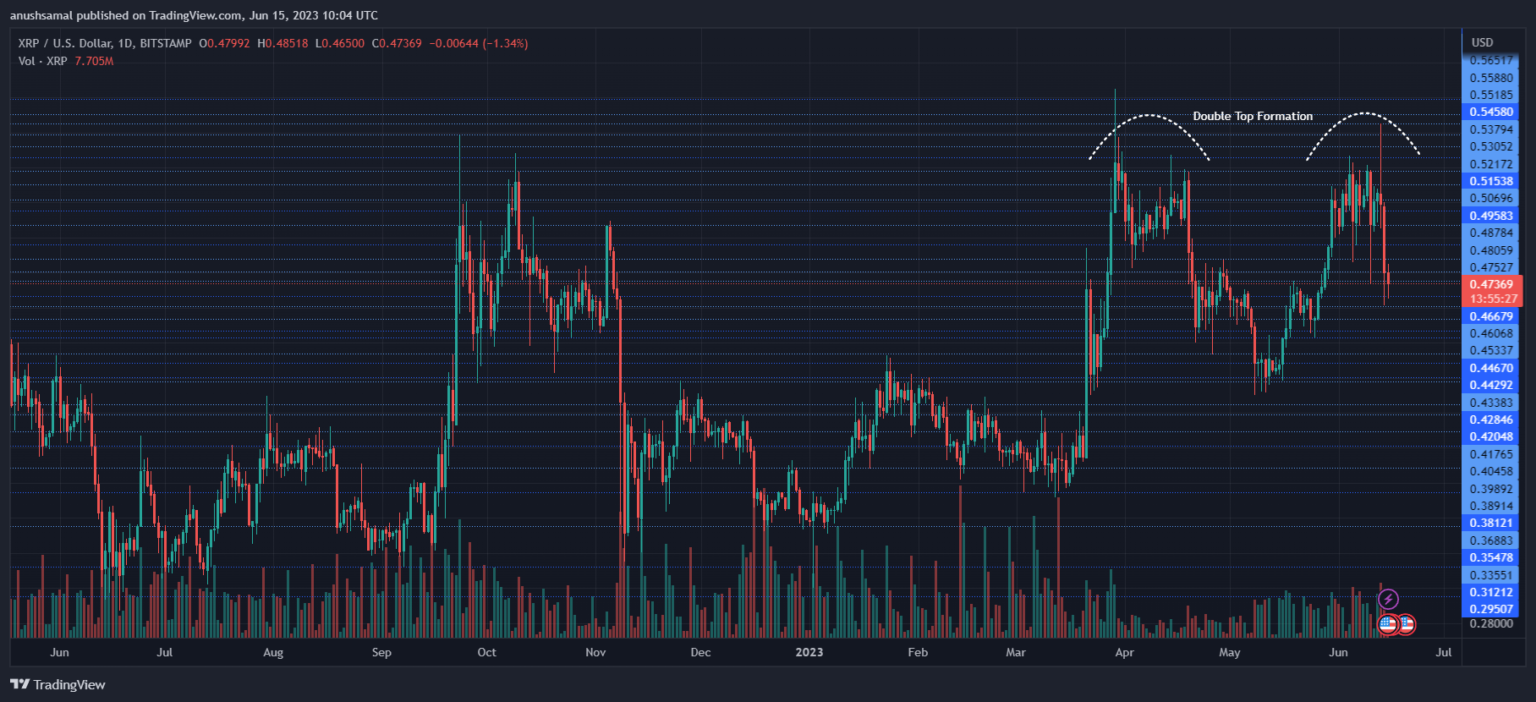 Furthermore, the altcoin has shaped a bearish double-top sample, indicating a possible reversal in its worth pattern because it strikes downward on the chart. The buying and selling quantity of XRP has additionally declined within the final session, suggesting that sellers have taken management of the asset.
