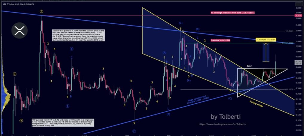 A distinguished cryptocurrency analyst on TradingView, Tolberti, who boasts a following of over 23k customers, has put forth a bullish perspective for XRP’s worth motion. Tolberti means that the XRP market may expertise an 83-350 p.c surge following its latest breakout.