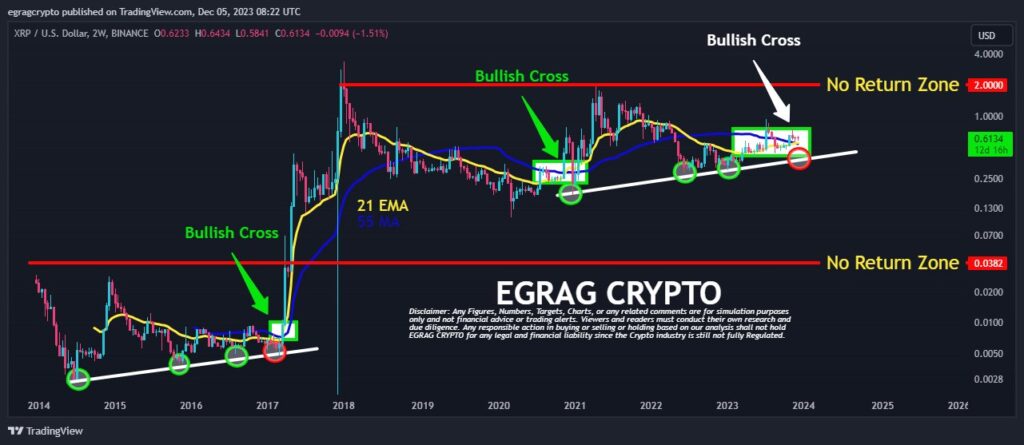Notably, the chart of Egrag additionally options an ascending pattern line, a bullish indicator, which XRP has examined twice, as proven by the 2 inexperienced circles in mid-2022 and early 2023. These faucets on the pattern line are crucial, as they recommend that every contact is a take a look at of assist the place the value finds sufficient consumers to start a brand new upward motion.