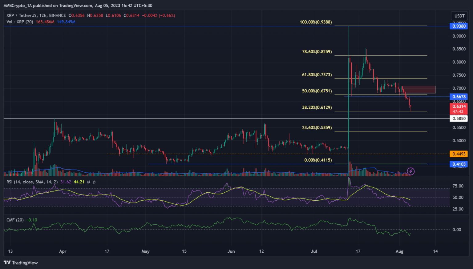 Equally, the Chaikin Cash Stream has stayed beneath the edge since late July, denoting the diminished capital inflows to XRP markets. The above bearish strain tipped XRP to crack a vital 50% Fibonacci retracement degree of $0.6751.