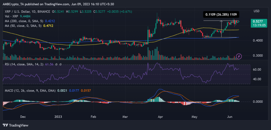 From 9 Might to 9 June, the worth development device revealed an upward trajectory, culminating in a formidable surge of over 26%. As of this writing, Ripple was buying and selling at roughly $0.5, showcasing a modest however noteworthy enhance of practically 1%.