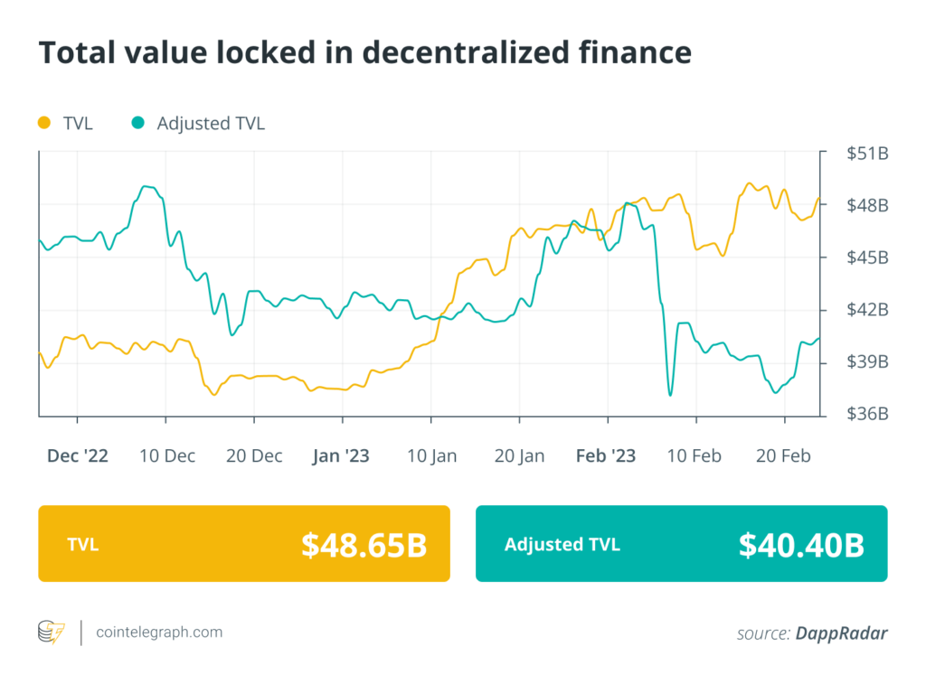 Analytical knowledge reveals that DeFi’s whole market worth dipped beneath $50 billion this previous week. Information from Cointelegraph Markets Professional and TradingView reveals that DeFi’s prime 100 tokens by market capitalization had a blended week, with a lot of the tokens buying and selling in inexperienced whereas just a few others bled in purple.