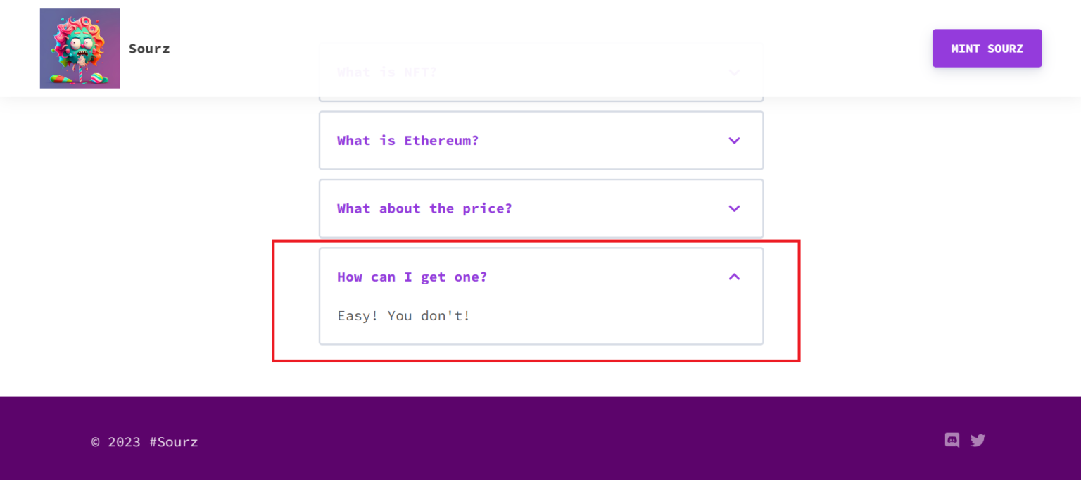 SourzNFT FAQ highlighting that no customers can get the NFTs. Supply: sourznft.com (CoffeeZilla)